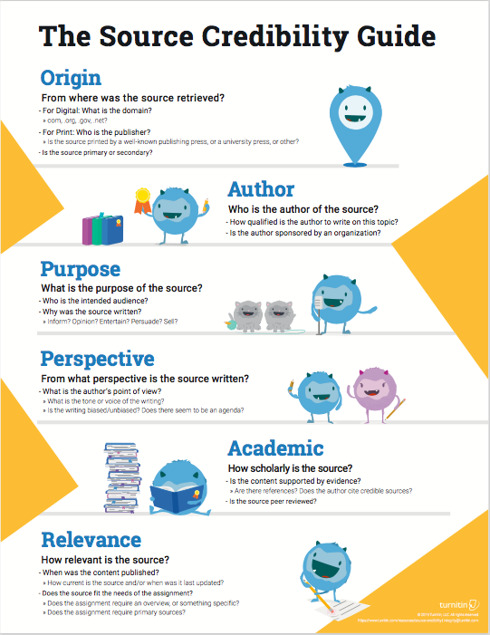 Last summer, Turnitin shared a pack of free resources focused on helping educators teach students strategies for evaluating the credibility of sources. This set of resources, known as The Source Credibility Pack, contains over thirty classroom-ready files to be used and adapted for middle school, high school, and higher education classrooms. The resources are designed around The Source Credibility Guide, which proposes a six-step process for evaluating the credibility of sources. Each step in the process is organized as a lesson with corresponding practice activities. Example resources include a teacher guide, lessons (videos and slides), practice hand-outs, pre-post assessments, and a rubric trait.