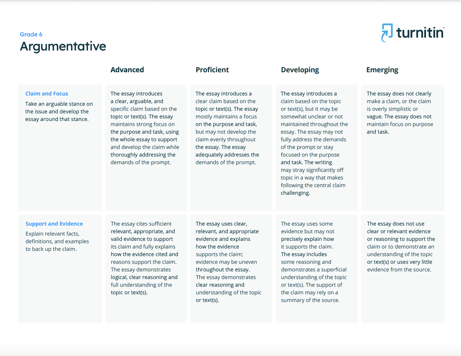 Consider using the 6th-8th Grade Argument QuickMark set with this rubric. These drag-and-drop comments were tailor-made by veteran educators to give actionable, formative feedback directly to students. While they were explicitly aligned to this particular rubric, you can edit or add your own content to any QuickMark.