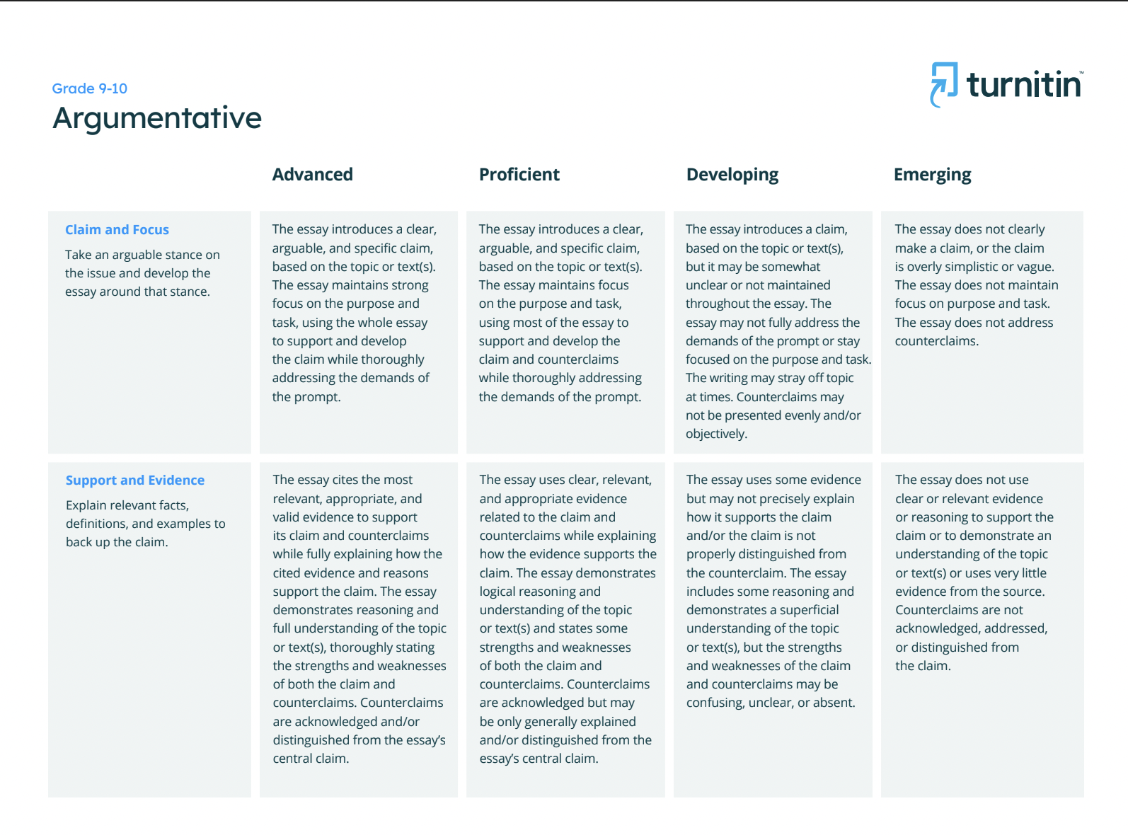 Download this .rbc file for the full text rubric and then import it to your Feedback Studio account. You can then use this rubric as is or customize its content to suit your needs.