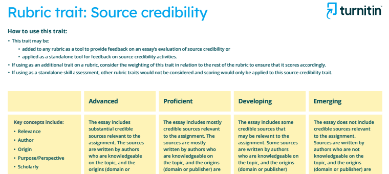 Consider using the Source credibility QuickMark set with this rubric trait. These drag-and-drop comments were tailor-made by veteran educators to give actionable, formative feedback directly to students. While they were explicitly aligned to this particular rubric trait, you can edit or add your own content to any QuickMark set.